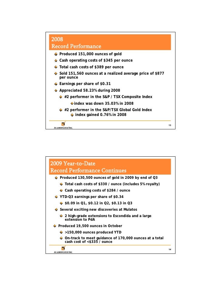 Finished the third quarter with gold sales of 93,028 ounces at a total cash cost(1) per ounce sold, net of by-product sales, of $528 per ounce. The combination of increased gold sales and the continued strength of the gold price led to another quarter of strong financial ... Doc Viewer